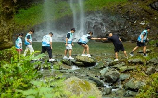 图为团队成员溯源仙女瀑布,探寻生漆生长之秘