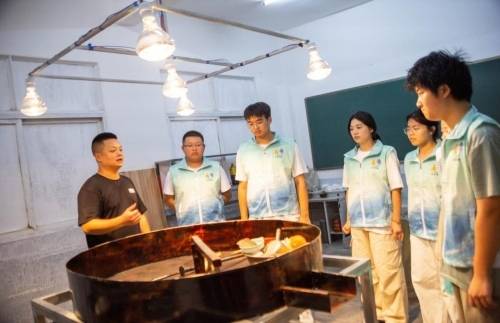 随后,团队成员奔赴天宝漆院,近距离观察生漆加工设备,学习从漆树汁液采集到成品制作的全流程工艺,系统了解生漆产业全链条发展模式,并对生漆的漆酚检测、生漆精制加工及储存条件等展开专业询问。李尚昂分享了他数年“与漆为伴”的经验。他提到:“现代化学漆虽便捷,但天然生漆的耐久性与环保价值不可替代。”团队成员围绕漆料应用中的干燥控制、色彩稳定性等问题与李师傅深入交流。