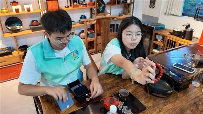 镜头缓缓推进,主播们跟随漆艺非遗传承人彭涛、天宝漆院主理人李尚昂,穿梭于琳琅满目的各种漆器之间,用生动而富有感染力的语言讲述着每一件漆器背后的故事与工艺,将观众带入色彩斑斓、工艺独特的漆器世界。“这就是大名鼎鼎的《鹤翔于天》茶盏,你看,线条勾勒流畅舒展,仙鹤振翅灵动欲出,釉色如凝脂般温润,寓意吉祥如意,尽显古典雅致。每一寸光华,都凝聚着匠人的心血与热情。”在学长学姐的推介声中,满是自豪。