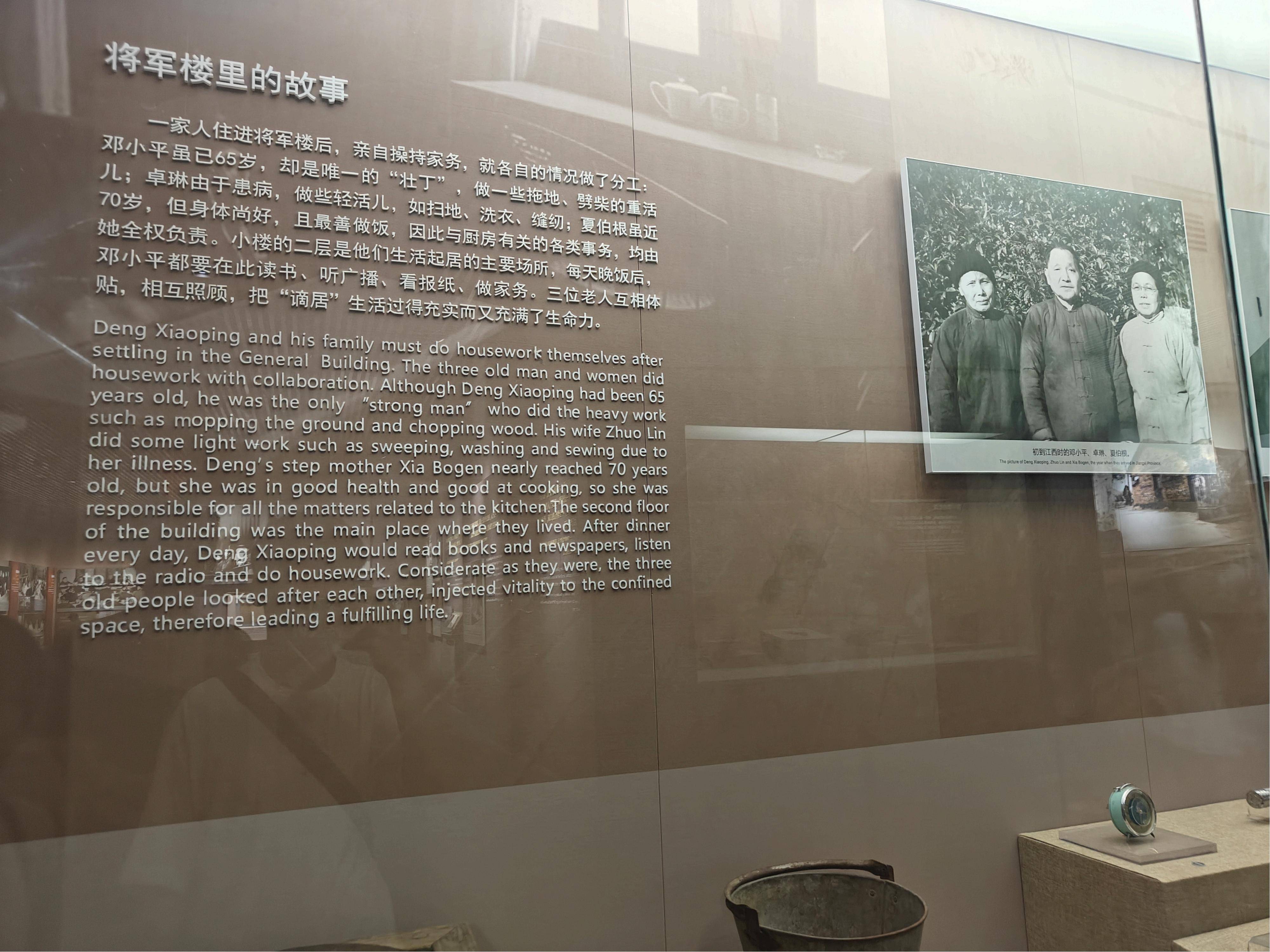 在“将军楼”生活场景复原区,队员们看到了邓小平一家在此居住时的简朴布置:简单的桌椅、自制的家务工具、泛黄的报纸……“文化革命”期间物资匮乏,邓小平与家人分工操持家务,65岁的他主动承担劈柴、拖地等重活,继母负责做饭,妻子卓琳料理轻家务,三人相互扶持,将“谪居”生活过得充实而有力量。